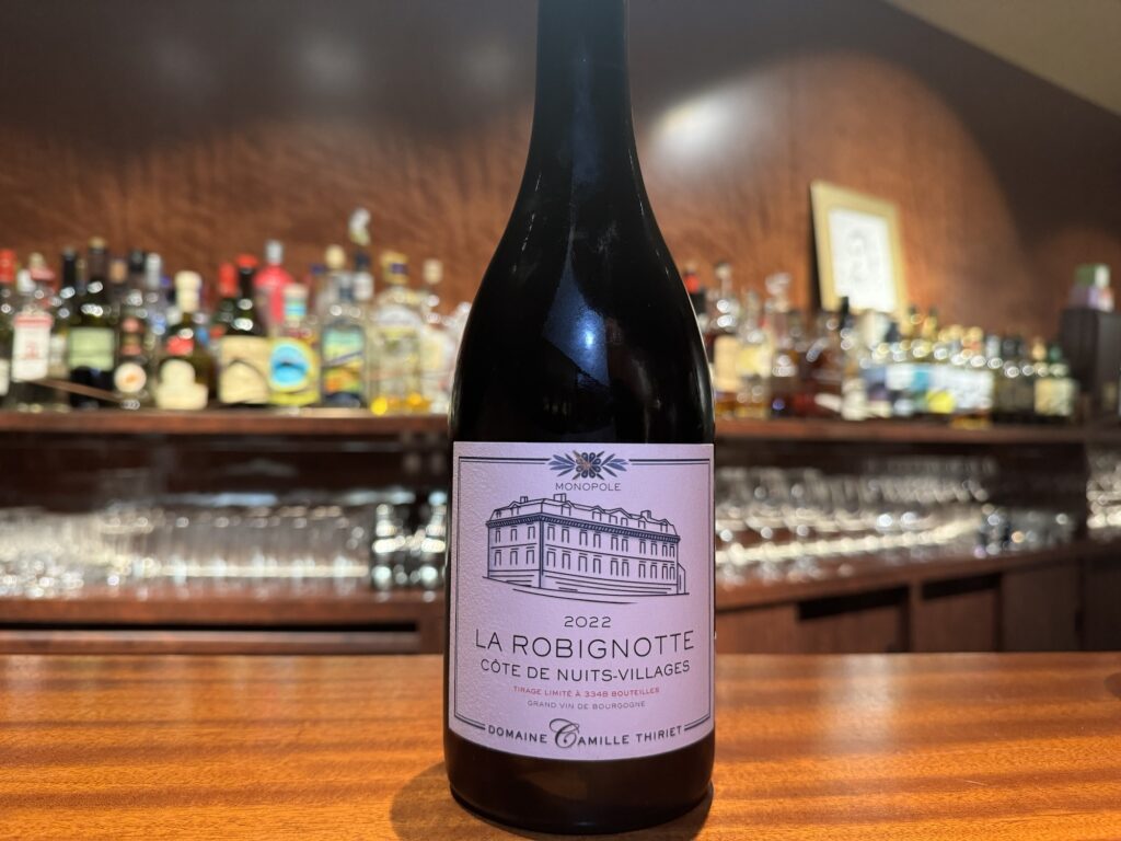 【ラ ロビニョット モノポール カミーユ ティリエCOTE DE NUITS VILLAGES LA ROBIGNOTTE MONOPOLE2022 Camille Thiriet】樹齢60年。粘土石灰質土壌。0.58haの単一畑で青い泥灰土。40%全房発酵、コンクリートタンクで2週間発酵、その後樽熟成(新樽15~20%)